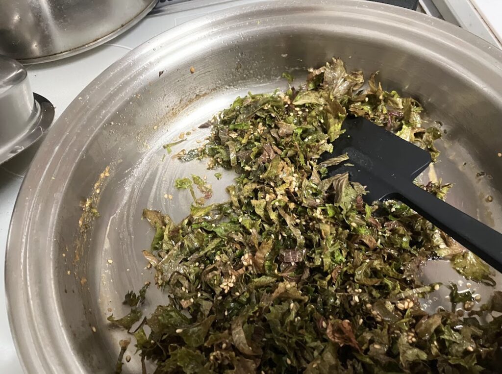 ちょっと、葉っぱが固めなので、細かく千切りにしました。