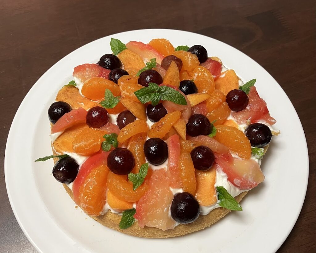 そして、残った生クリームに砂糖大さじ1入れてホイップしまして、焼き上がり冷めてから、クリームをのせて、各フルーツをトッピング。