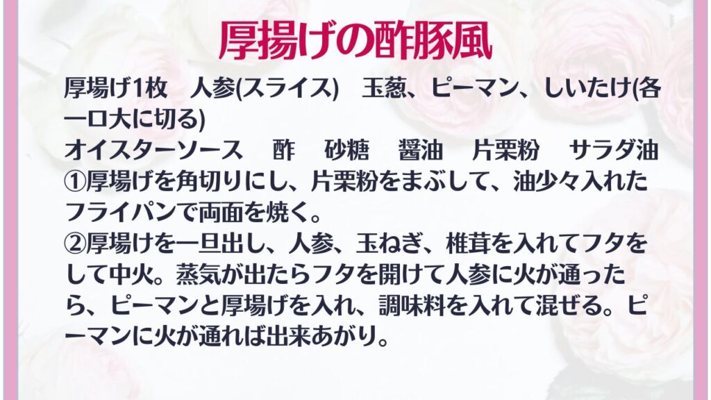 - 11月のノーミートクッキングより♪(厚揚げの酢豚風・舞茸ごはん・キムチスープ)