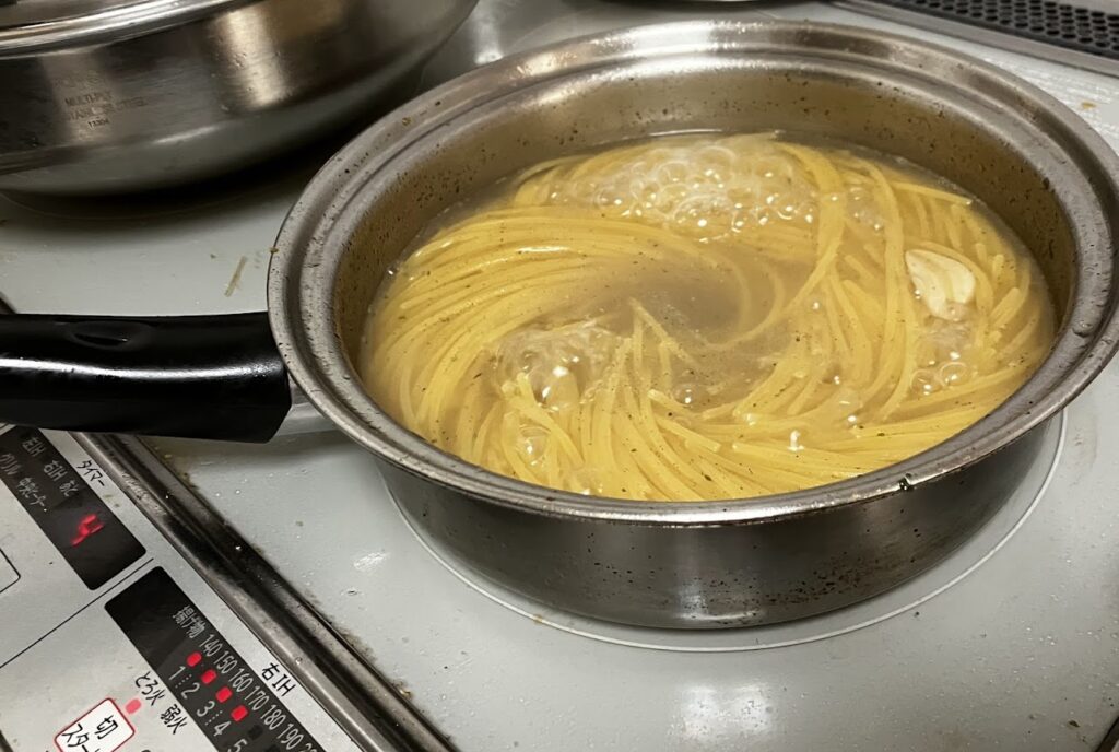 パスタの種類によって、水分の吸収が違うので、様子を見て水気が少なければお湯などを足します。