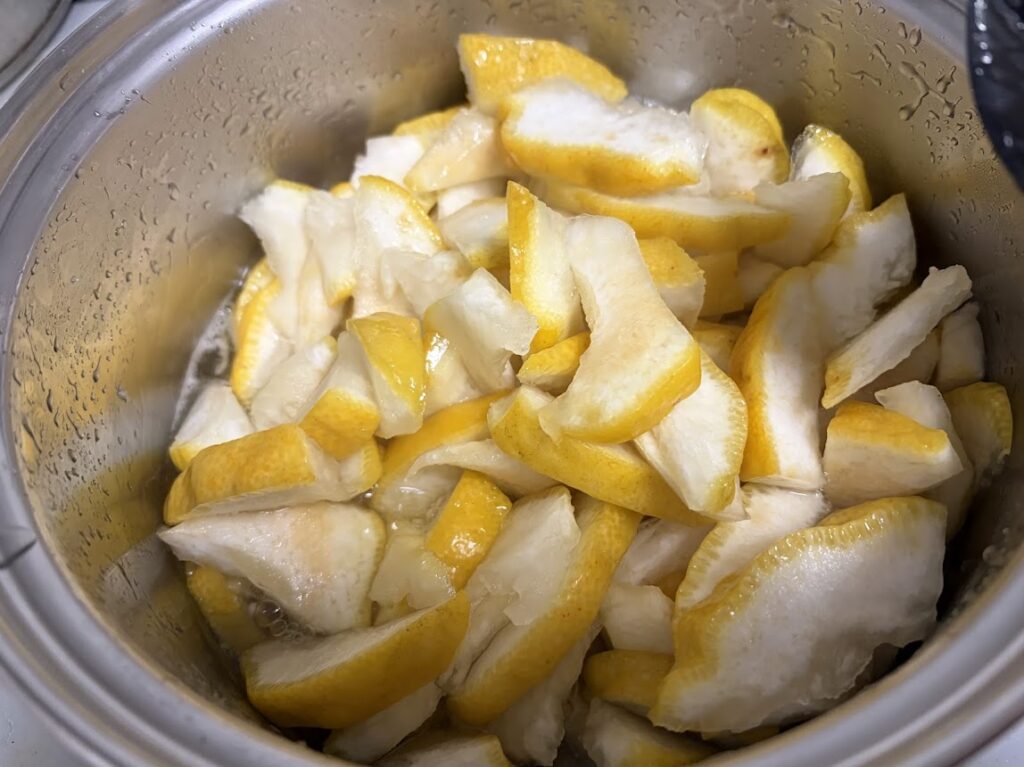 鬼柚子は煮こぼさなくても美味しいピールに出来上がります。