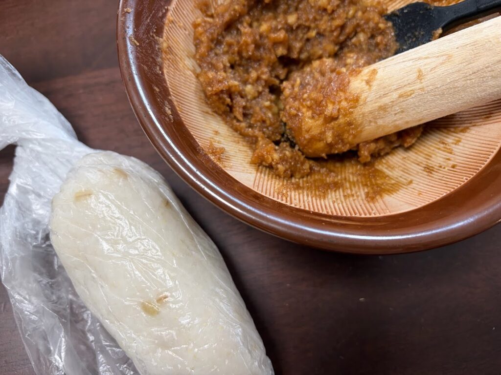 くるみをすりこ木で潰して、好みの大きさにしておきます。