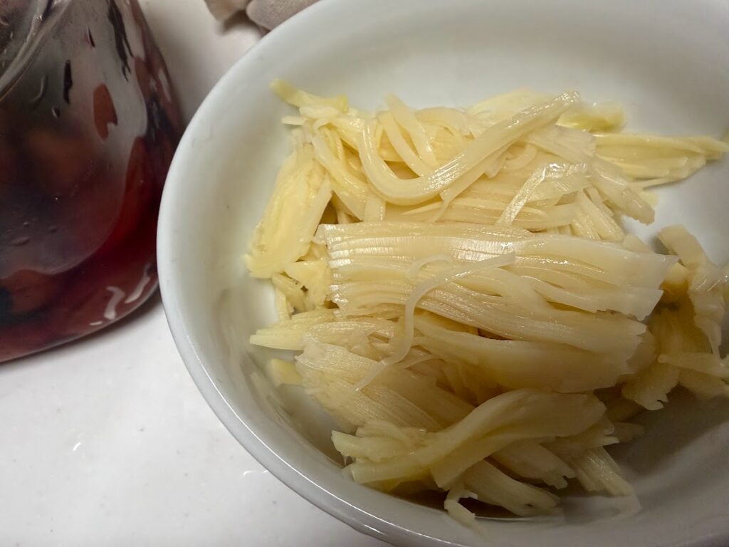 ともあれ、皮部分の裏の白っぽい部分を、包丁当てるだけで切れる柔かい場所を細切りにして。
