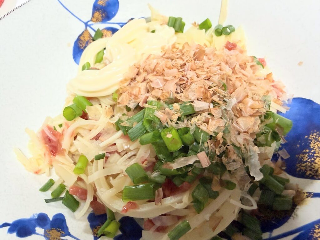 梅干しを細かくカットして、それにかつお節と、青ネギと、マヨネーズで和えます~。